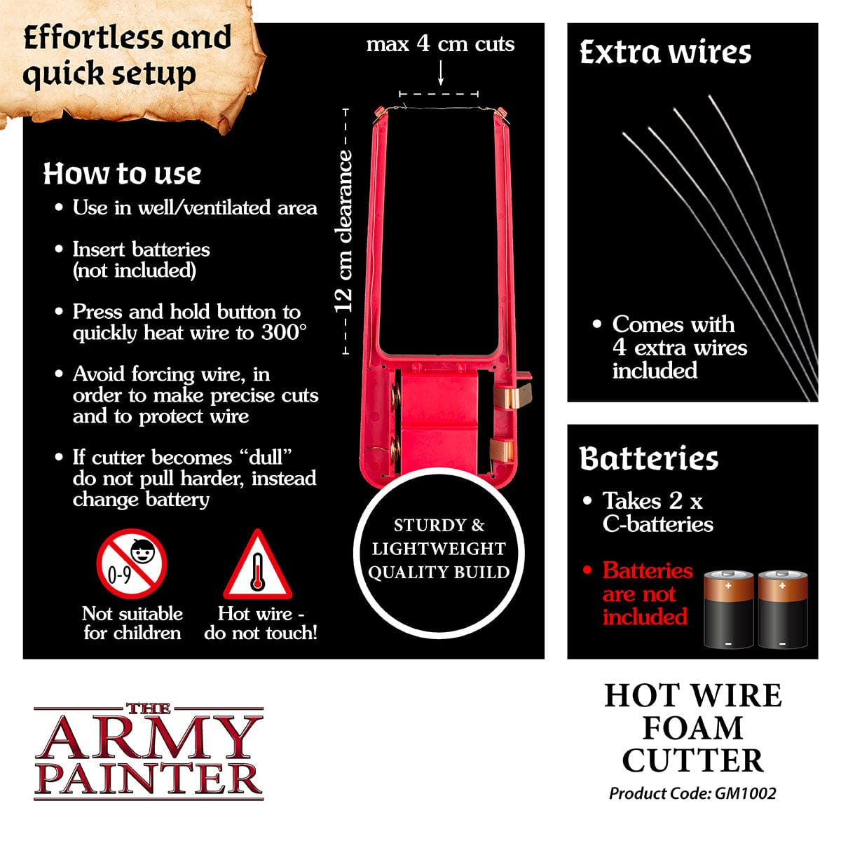This incredibly precise Hot Wire Foam Cutter will give you clean, accurate and fast cuts – every time! It is the perfect tool for cutting XPS foam sheets for any dungeon backdrop, wargaming terrain or landscape scenery. Including 4 extra wires.
