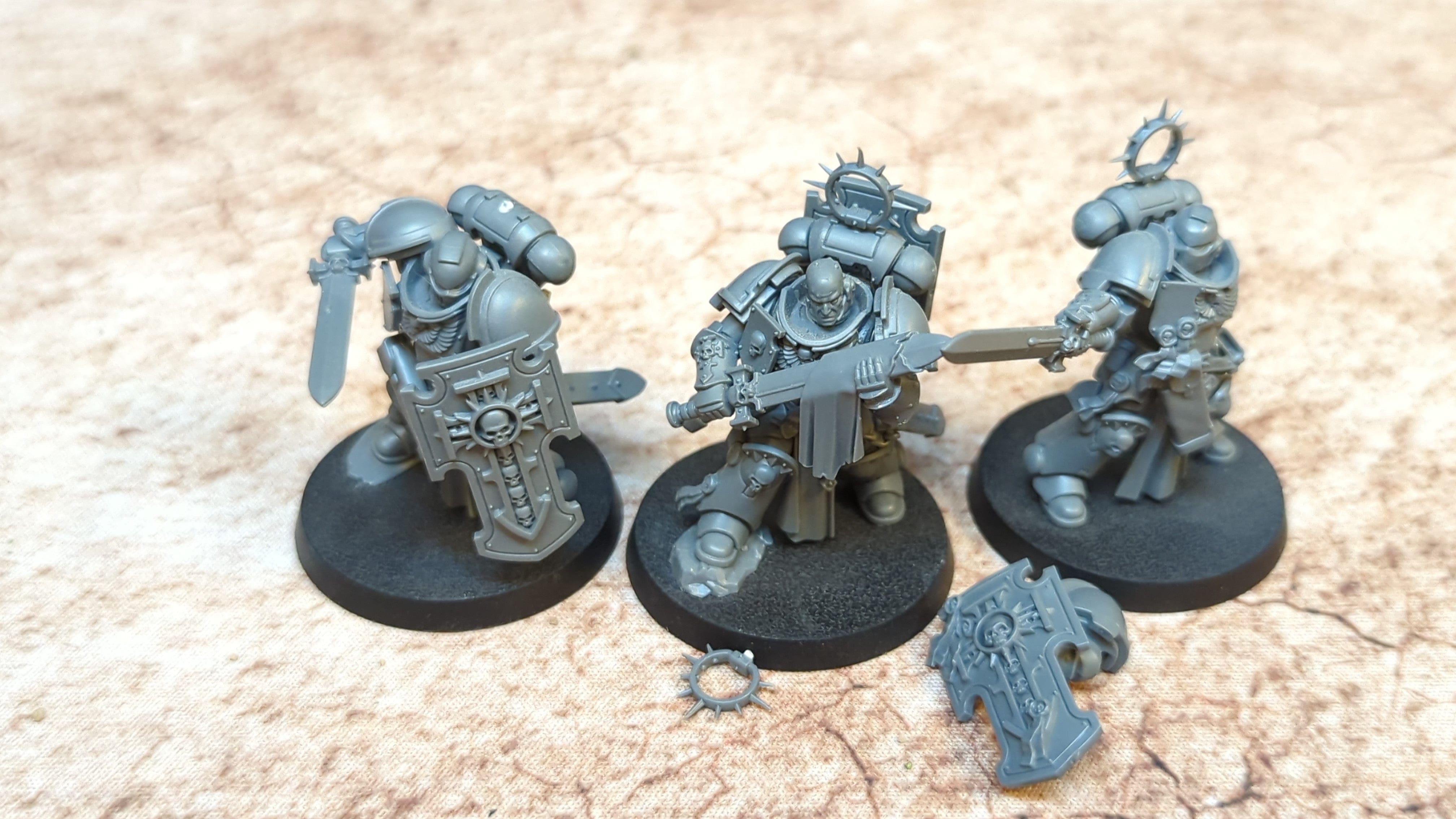 Space Marines Bladeguard Veterans x3. Unpainted or partially painted. Assembled or partially assembled models. Please refer to the pictures for additional details, if any, before buying.