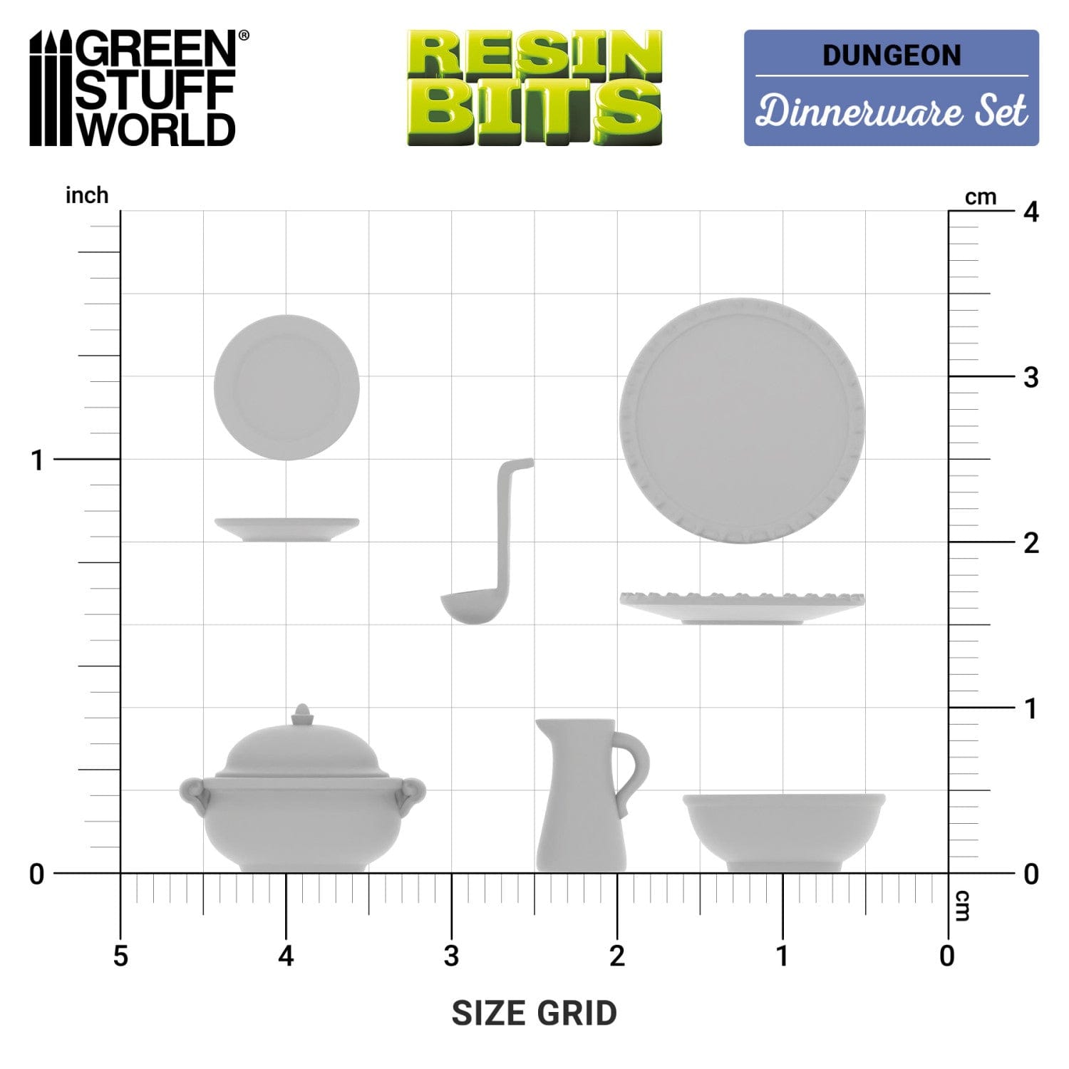 Bring your roleplaying scenarios to life with the dinnerware set, a collection of resin bits perfect for designing detailed scenes of great feasts, a castle dining room, remnants of a battle, taverns, and camps, among many others. It includes plates, bowls, a jug, a soup tureen, etc. This set is perfect for dioramas and thematic scenes, enriching the visual narrative with touches of everyday life.