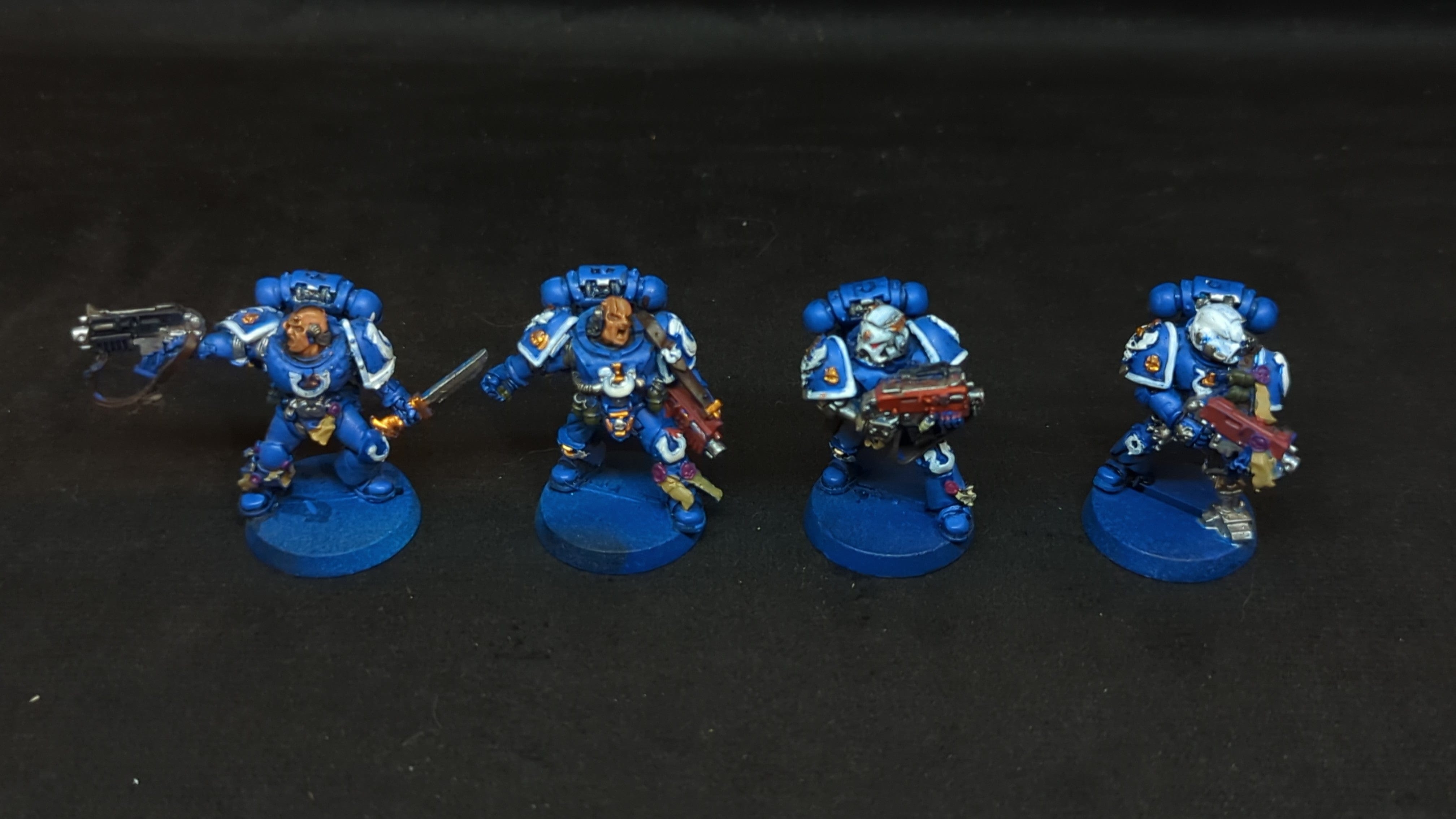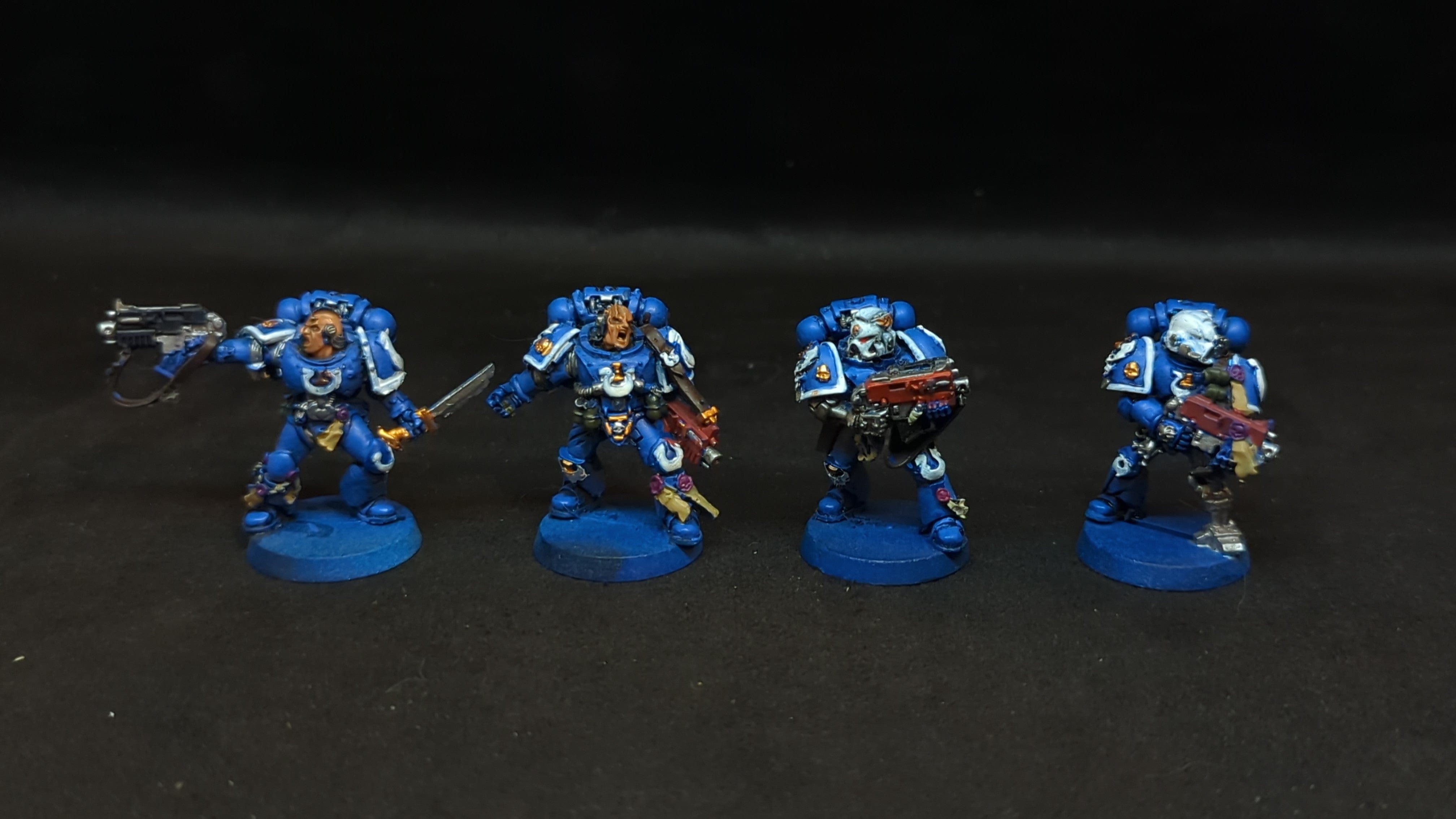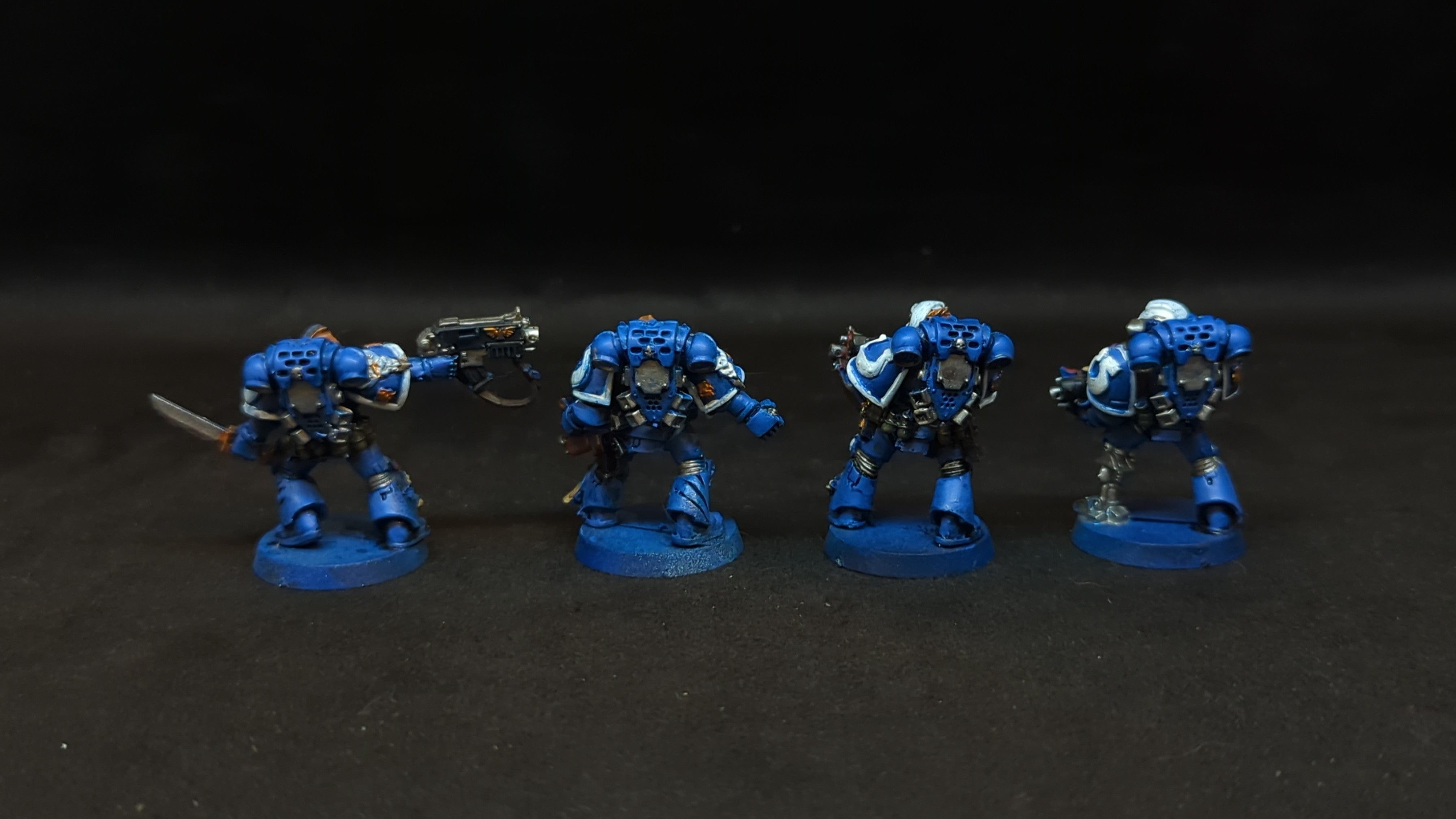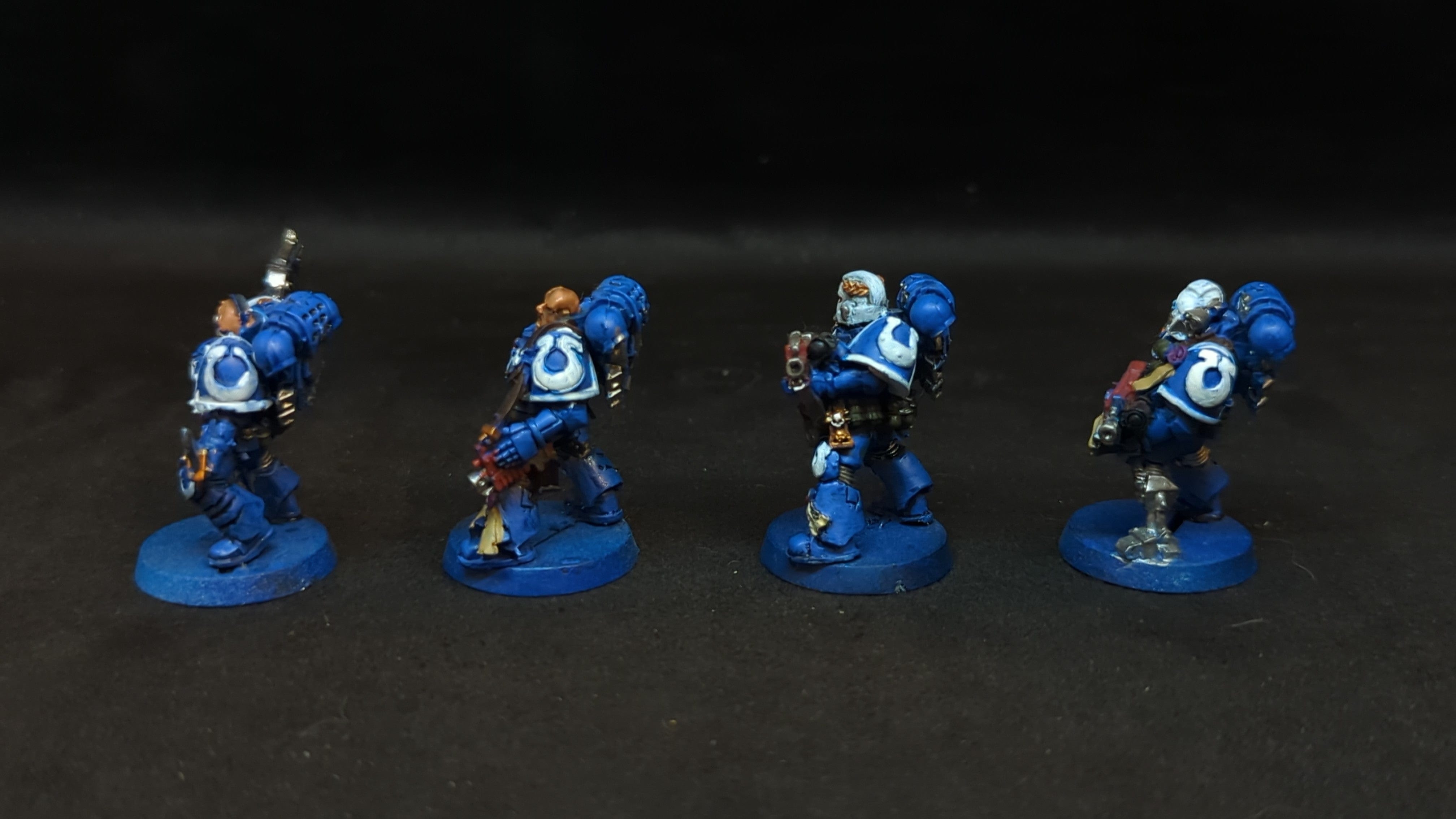 Space Marines Tyranic Wars Veteran x4. . Out of print model. Painted models. Assembled or partially assembled models. Please refer to the pictures for additional details, if any, before buying.